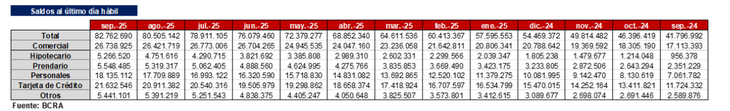 According to a survey of First Capital Groupbased on data from the Central Bank (BCRA)the balance of credits in local currency as of September 30 was $ 82.8 billion. This meant a real monthly improvement of just 0.6%, the second worst data since March 2024, only surpassed by August of this year.