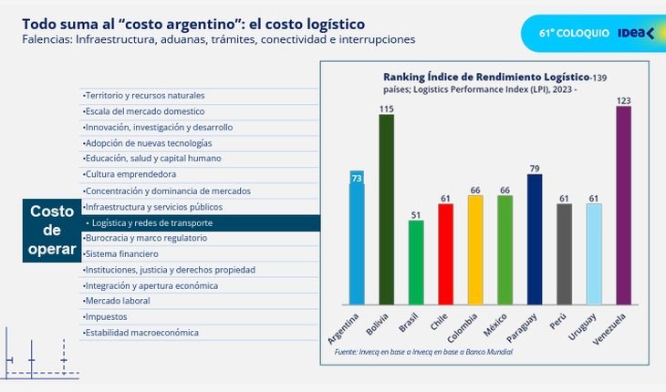 One of the first axes highlighted as problematic is logistics, where Argentina occupies 73rd place among 139 countries, “below the middle of the table and just above Bolivia and Venezuela.” As he explained, The poor performance is due to the poor condition of the routes, poor port infrastructure, slow customs, excessive procedures and frequent interruptions in transportation. “All this translates into one of the heaviest stones: the logistical cost,” he stated.