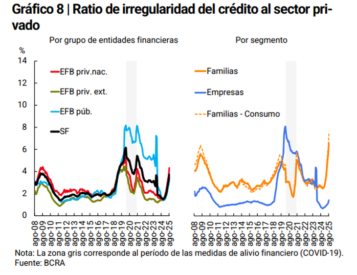 This was reported by the Central Bank (BCRA) through its Report on banks. It indicated that the irregularity ratio of family loans advanced by 0.9 percentage points (pp) compared to July and reached its maximum since the monetary authority began records, in 2010.