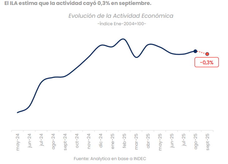 The consultant Equilibra calculated a monthly contraction of 1% in its own Monthly Economic Activity Estimator (EMAE) for September. This was explained by a 1.3% decline in the indicator that excludes the agricultural sector, since the latter had an improvement of 2.4%.