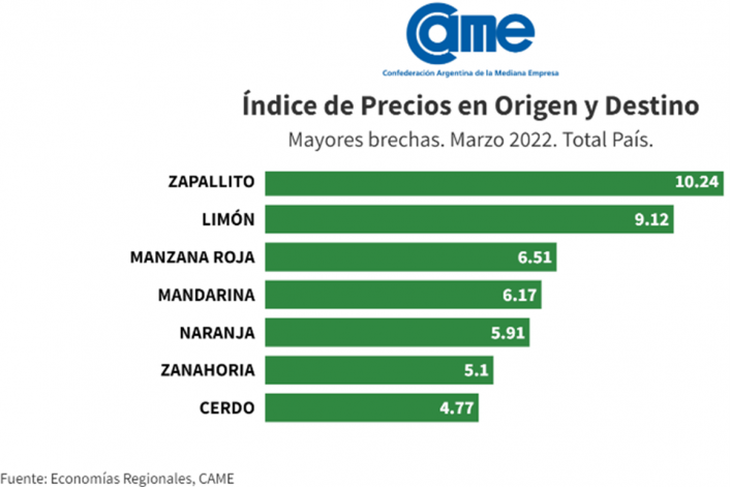 In March, the largest gap between the price of origin and destination was for zucchini, with a difference of 10.24 times. It was followed by lemon (9.12 times), red apple (6.51 times) and tangerine, with a gap of 6.17 times. The products with the smallest gaps, meanwhile, were: eggplant (1.72 times), eggs (1.74), chicken (1.80 times), cabbage (2.10) and Swiss chard (2.24).