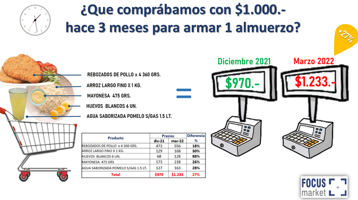 In this case we can see that in December 2021 we bought for lunch: battered chicken 360 grams, long fine rice 1 kilo, 6 eggs, and a flavored water of 1.5 liters with less than a thousand pesos ($970), however 3 months later we need to cover this breakfast $1,233.-, 27% more .