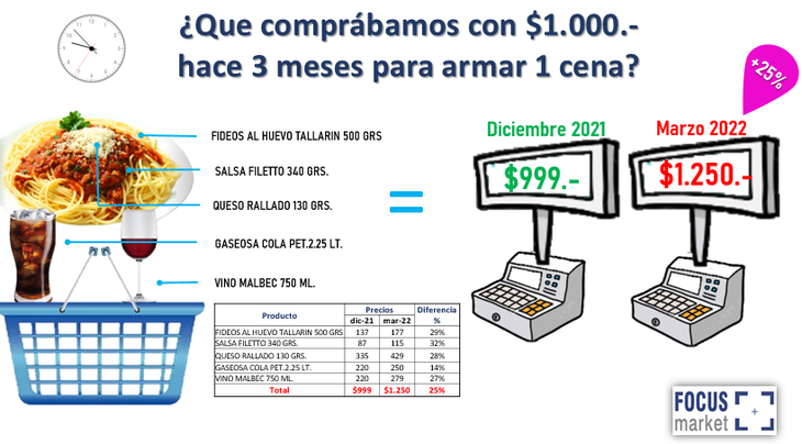 We also revealed that we could buy for dinner in December 2021: 500 g tagliatelle noodles, 340 g fillet sauce, 130 g grated cheese, 2.25 liter cola and a 750 ml malbec wine, with less than $999, however 3 months later we need $1,250 to cover this breakfast, a 25 % plus.