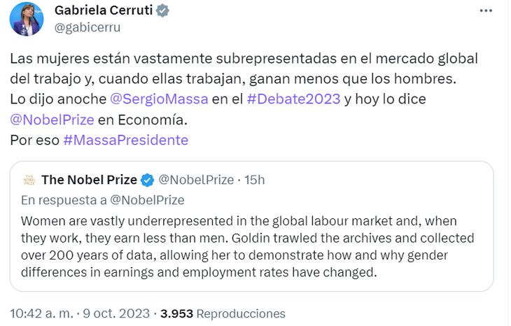 From Peronism they cited the recognition by the Swedish Academy to counterargue the version of the La Libertad Avanza candidate, Javier Milei.who in the first debate stated that if inequality existed, only women should work in a company, however, “there are half men and half women.” The presidential spokesperson, Gabriela CerrutiAfter the news he tweeted: “Denying the gender gap, climate change and genocide is going against the grain of the world and the advancement of science.”
