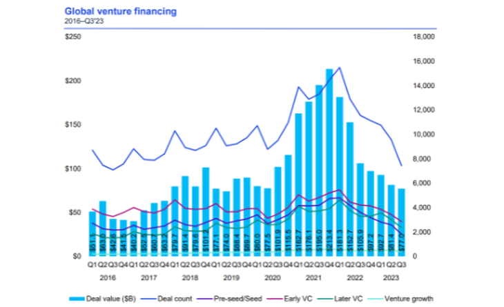 Global transaction figures in Venture Capital continue to decline, as detailed in the latest edition of the KPMG study, which revealed sector data for the third quarter of 2023.