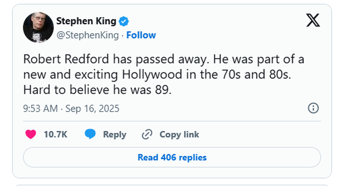 The writer Stephen King He also added: “Robert Redford has died. It was part of a new and exciting Hollywood in the 70 and 80. Difficult to believe that I was 89 years old “.