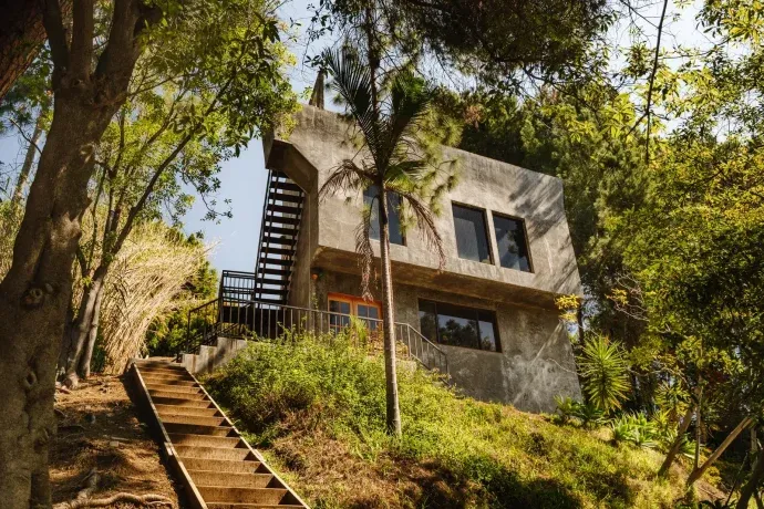 He brutalist and modern style From the mid -twentieth century it crosses all the property. The large concrete blocks in Zig Zag are part of both exterior and interior areas. The facade on the other hand is covered in pink concrete. The windows are very wide, so they allow the interior to merge with the natural environment of the hill, generating a continuity between open and internal spaces.