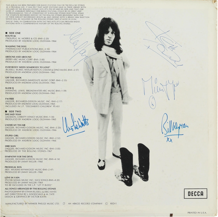 There is a copy of the rarest album of the Rolling Stonesthe 1969 “Promo Album”, signed by all five band members (£6,000-8,000), and acetates of the group’s 1970 live album “Get Yer Ya-Ya’s Out!” as originally conceived, as a double disc with a companion album featuring the opening acts BB King & Ike & Tina Turner on Apple Records.