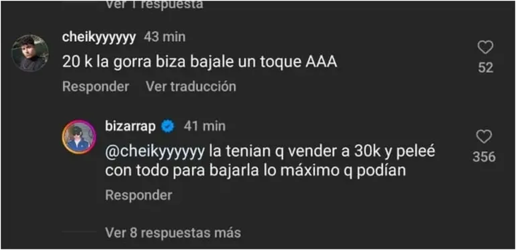 The publication was filled with comments excited by the possibility of buying his idol’s cap. However, some complained about the high price, so Bizarrap himself chose one of them to reply to the post and explain himself: “They had to sell it for $30,000 and I fought with everything to get it down as low as they could”.