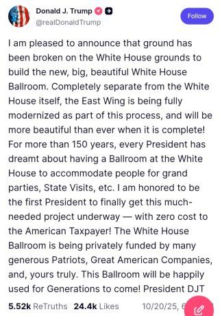 “I am pleased to announce that construction has begun on the White House grounds on the large, beautiful new White House Ballroom.”Trump indicated on his Truth Social platform.