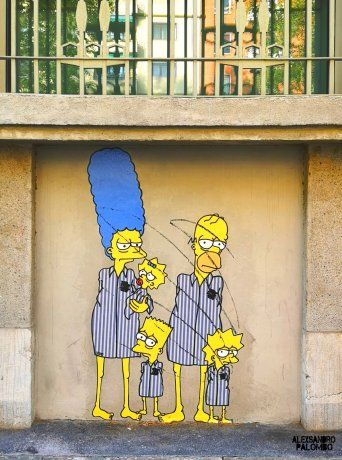 on the wall appear the five members of the famous family TV cartoon (Homer, Marge, Lisa, Bart and Maggie) dressed in striped pajamas with which they identified the deportees to the Nazi death camps.
