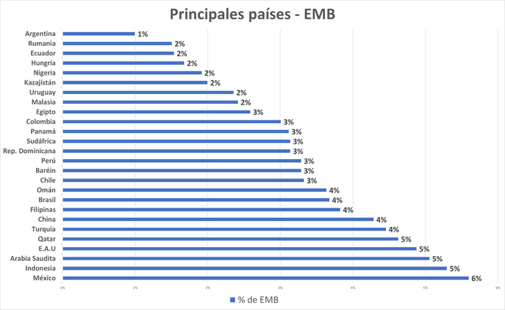 EMB is made up of bonds from 40 countries. The top 26 account for 85% of the fund, as seen below: