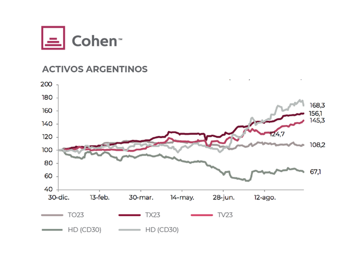 Hit markets. Even with a more stabilized internal front, in which the BCRA recovers international reserves while the Treasury moderates fiscal expansion (although it is insufficient to correct the imbalance in public accounts), given the complex global scenario and the uncertainty about upcoming government measures local assets did not have a good month. The exchange rate gap rose again, sovereign bonds in foreign currency and the Merval fell significantly, while bonds in pesos rose along with inflation. Specifically, as of Wednesday, September 28, sovereign bonds in foreign currency marked falls of 10.4%, with those of foreign legislation being the most affected with falls that exceeded 11%; the Merval measured in CCL dollars accumulated a drop of only 7% since YPF compensated for the strong declines of the rest of the panel by registering an increase of 15% (in the year it accumulates a gain of 68%). On the side of the bonds in pesos, the most demanded were those adjustable by CER, which rose 8% -hand in hand with the longest tranches that gained more than 10%-, closely followed by bonds adjustable by type of interest. change (DLK and Duals) that recorded increases of around 8% (only the T2V2 was out of tune, which rose less than 2%). The big losers of the month were fixed-rate bonds, which averaged 4.2% declines.