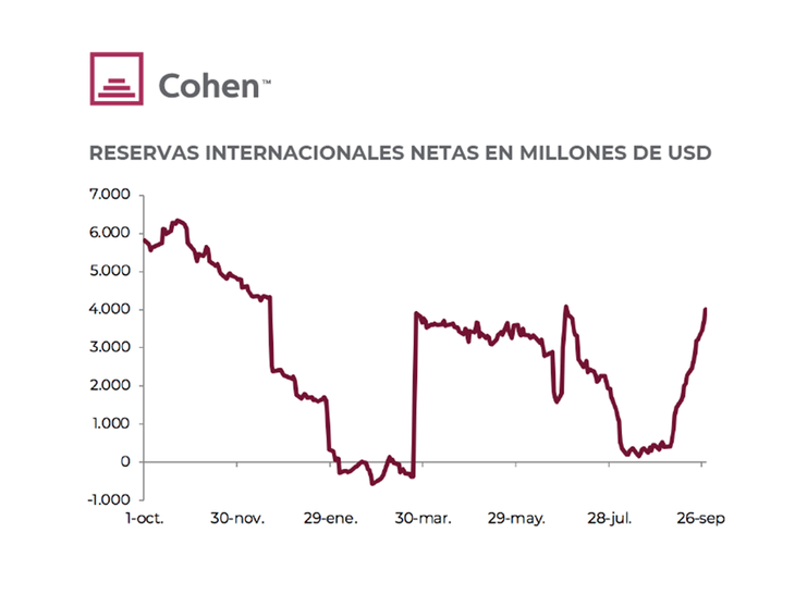 BCRA recovers reserves. With the greater supply of agriculture, lower energy payments and an exchange control that does not yield, the BCRA took advantage of the greater liquidation of agriculture to buy foreign currency in the exchange market and recover international reserves. In fact, while in the first eight months of the year the balance of operations in the foreign exchange market was practically neutral –against net purchases of more than USD7,000 M in the same period last year–, in September it will have bought more than USD 4,000 M. Although it does not manage to meet the reserve target for the third quarter agreed with the IMF, which pointed to a stock of USD 6,500 M, with these interventions the stock of net international reserves rose to USD 4,500 M and gives it greater firepower to the BCRA to contain the pressure of abrupt adjustment of the exchange rate facing a fourth quarter in which the lack of foreign currency will be accentuated.