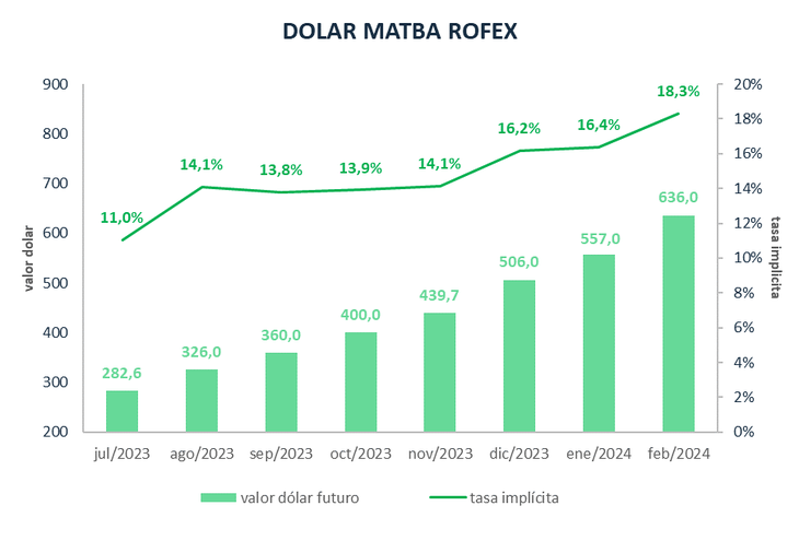 What is interesting is what the market expects for the coming months: until December a higher crawling peg rate compared to the current one, gradual (14%) but with a change of mandate there would be a jump of 16-18.3%. This can be seen in the implied future dollar rates.