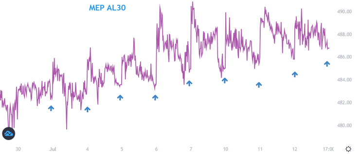 The MEP dollar is stabilized at $485, while the CCL is at $500, moving just 3% in the last month. Large orders are observed daily in the bond market that lead to the assumption that it is the government. And precisely, these orders are usually just before the closing of the wheel, so that the photo of the day comes out well, that is, with a MEP that did not vary so much compared to the previous day. The truth is intraday there is some more volatility. This It can be seen in the following graph where the AL30/AL30D price ratio is represented, in 5 minutes. The losses are seen before 5:00 p.m., when the market closes.