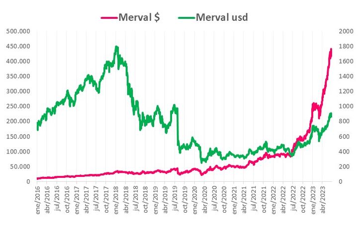 However, the stock market rose 135% in dollars last year due to the rally at the end of the year (being the stock market that rose the most in the world), a trend that is still observed in the market. So far this year, the local stock market has advanced 25% in dollars, encouraged by the same factors that boosted bonds: expectations of a change of government and a favorable tailwind for emerging markets.