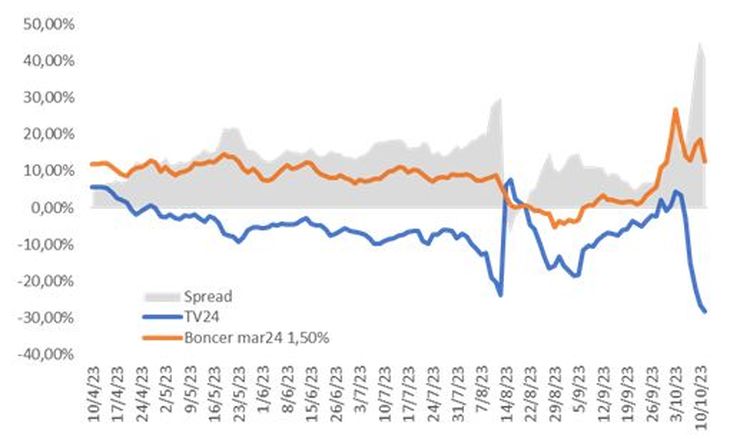 Last week, demand recovered very strongly and bonds such as TV24, which adjusts to the official dollar and expires in April 2024, went from accruing effective rates of +3%/4% to negative returns of around 30%. This is explained by strong demand and a direct increase in its price.