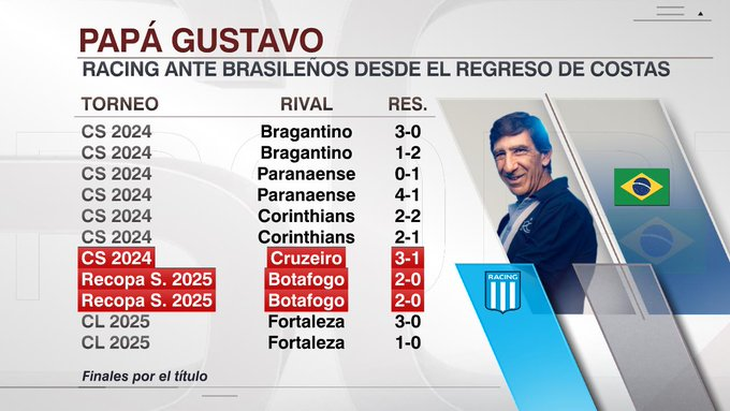 In total, in the coastal cycle, racing accumulate 11 matches against Brazilians, with a balance of 8 wins, 1 draw and 2 losses. Of course, the victories in the two international finals stand out. During that period he played against Bragantino, Athlético Paranaense, Corinthians, Cruzeiro, Botafogo and Strength.