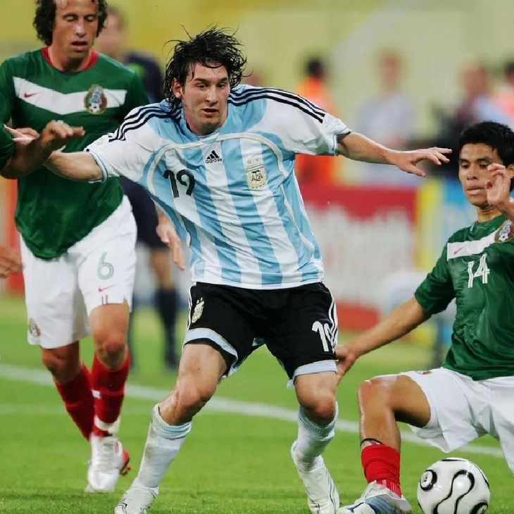 For Lionel Messi’s first World Cup there was a very particular design. The black strips on the shirt were along the sleeves and the neck, which also had a light blue detail. There was a gold stripe, and interrupted light blue and white canes.