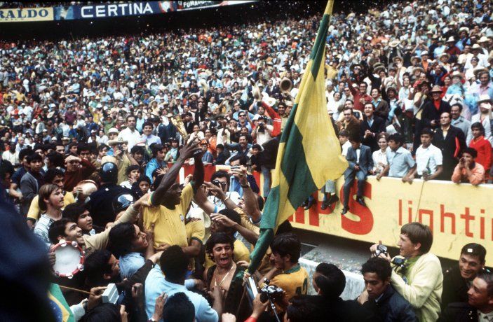 “Pelé, harassed by the press, staff and fans, holds aloft the Jules Rimet trophy after Brazil’s resounding 4-1 victory over Italy to win the 1970 World Cup. Pelé scored a goal during the final and assisted on two of the other goals, confirming that, despite the team’s enormous talent, his importance to him was unquestionable.”