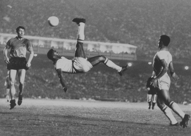 “Pelé scores a characteristically deft goal during a friendly match against Belgium at the Maracanã in 1965. One of a record 1,279 he has scored in his 21-year career.”