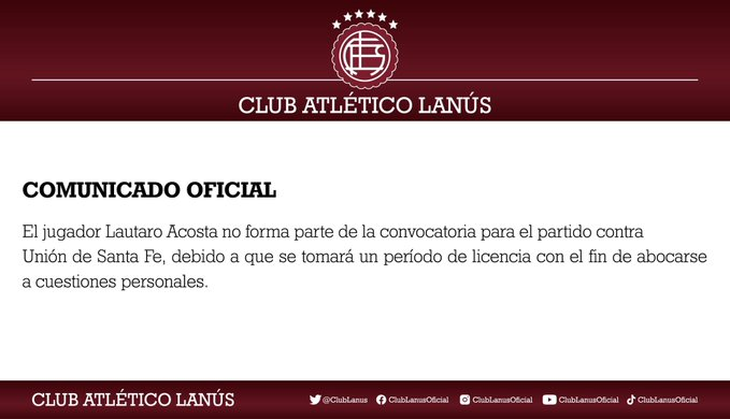 “The player Lautaro Acosta is not part of the squad for the match against Unión de Santa Fe, because he will take a period of leave in order to address personal issues”was the statement published by the club after announcing the list of players who will be part of the postponed match.